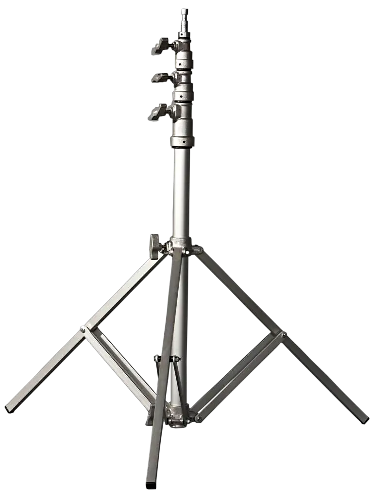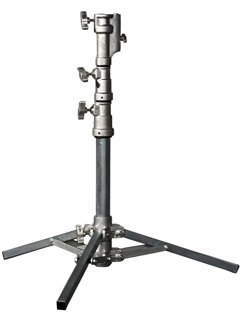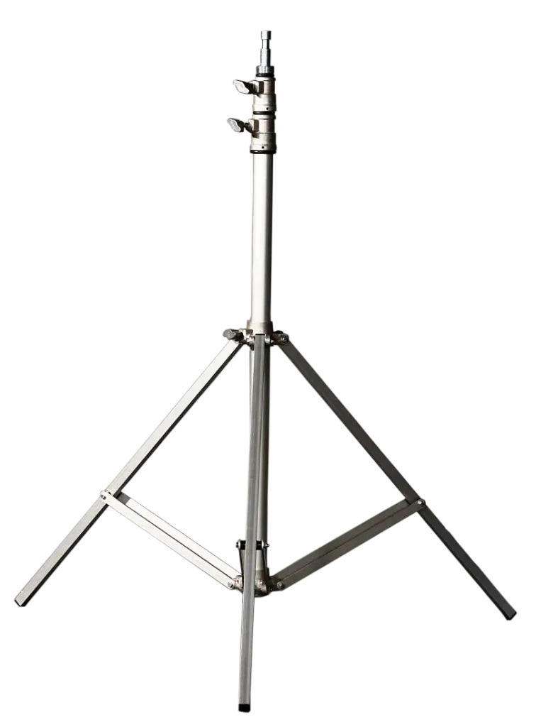 Tripé robusto e mais pesado do que o KIT. Ideal para externas e uso de refletor maiores. São 3 estágios com capacidade de 15 kg com margem de segurança. Luvas, estrelas e tubos em alumínio. O tripé recebe em sua fabricação as luvas de travamento feitas em duro alumínio evitando o arreamento do metal e consequente trincas e rachaduras por excesso de pressão no manipulo de travamento. O sistema de travamento dos estágios conta com uma “sapata” especial interna que não fere o tubo do tripé, mesmo que o operador force o manipulo para efetuar a trava dos estágios.