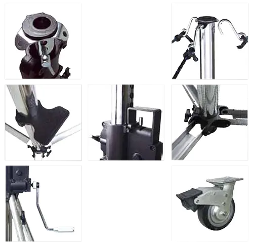 Suporta refletores de até 30 Kg. Tripé em aço cromado. 3 seções: diâmetro de 55, 44 e 38 mm. Amortecedores e nivelamento, permitindo ajuste de inclinação. Elevação máxima: 3,80 m 3 em 1: soquetes de 28 mm, 16mm além do multi direcional de 16 mm. A tensão durante a descida (breque) pode ser ajustada com uma chave Allen. Apoio para pé, que serve como degrau. A manivela pode ser travada para dentro do tripé, evitando uma acidental descida do equipamento.